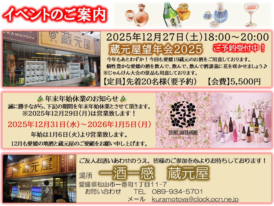 12月も愛媛の地酒と蔵元屋のご愛顧をお願い申し上げます。